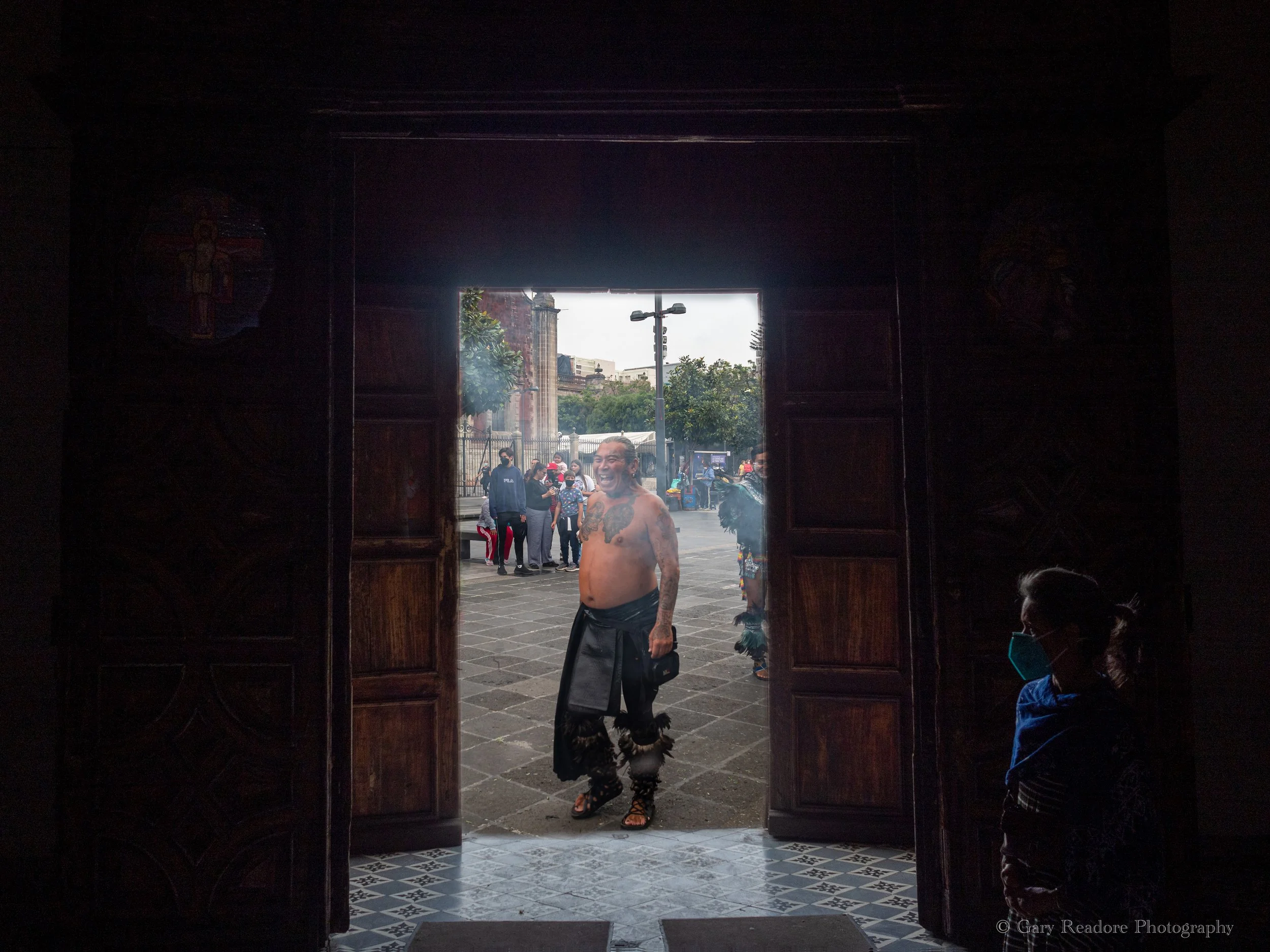 Mexico City photo manipulation. Masked woman inside Catholic church during Covid and Mexcian traditional native healer with face uncovered outside church door. Quite a juxtaposition!
